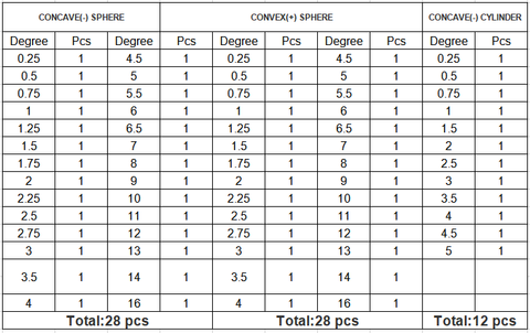 Convex(+) Sphere (1 pc each) 0.25,0.50,0.75,1.00,1.25,1.50,1.75,2.00,2.25,2.50,2.75,3.00,3.50,4.00,4.50,5.00,5.50, 6.00,6.50,7.00,8.00,9.00,10.00,11.00,12.00,13.00,14.00,16.00 (Total:28 pcs)